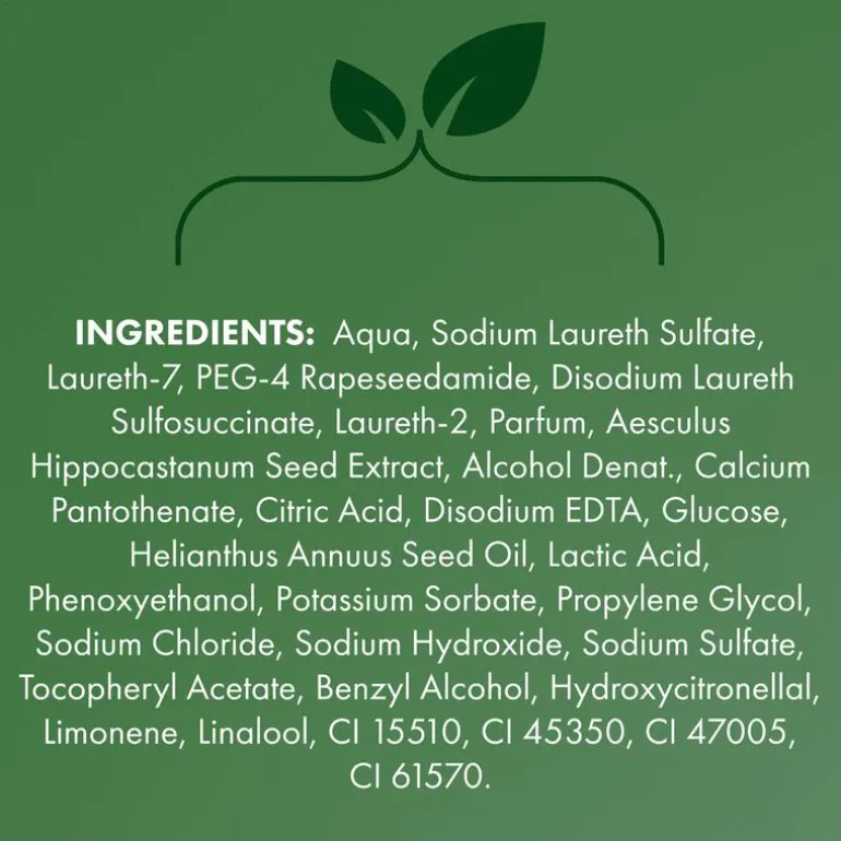 Aqua, Sodium Laureth Sulfate, Laureth-7, PEG-4 Rapeseedamide, Disodium Laureth Sulfosuccinate, Laureth-2, Parfum, Aesculus Hippocastanum Seed Extract, Alcohol Denat., Calcium Pantothenate, Citric Acid, Disodium EDTA, Glucose, Helianthus Annuus Seed Oil, Lactic Acid, Phenoxyethanol, Potassium Sorbate, Propylene Glycol, Sodium Chloride, Sodium Hydroxide, Sodium Sulfate, Tocopheryl Acetate, Benzyl Alcohol, Hydroxycitronellal, Limonene, Linalool, CI 15510, CI 45350, CI 47005, CI 61570