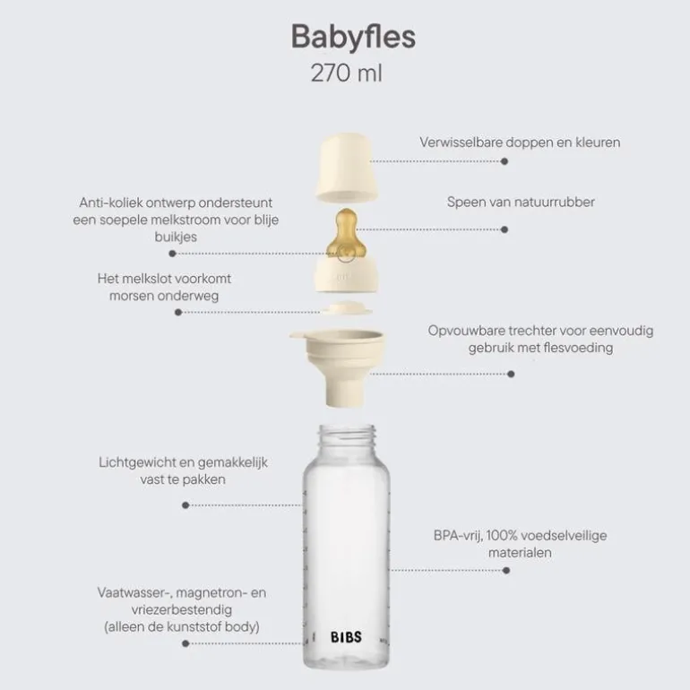 De flessen zijn speciaal ontworpen en ontwikkeld in het puurste en premium materiaal. Het is 100% veilig zonder schadelijke chemicaliën en brengt daardoor geen schadelijke stoffen over op de melk, waardoor het een gemakkelijke en veilige optie is voor ouders. De fles kan worden gebruikt en gematcht met de gehele BIBS collectie door kleur en vorm.