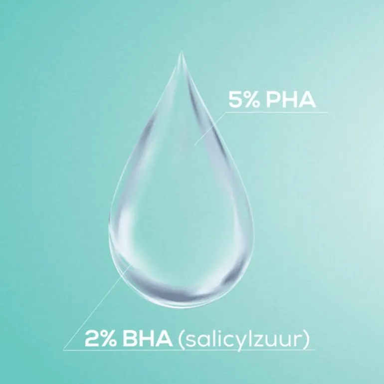 1. Exfolieert – De effectieve combinatie van BHA en PHA exfolieert mild en helpt dode huidcellen te verwijderen en de huidtextuur te verbeteren.2. Zuivert – BHA werkt dieper in de poriën en lost daar een teveel aan vuil en talg op. Het helpt zo tegen verstopte poriën en bij het verminderen van puistjes, mee-eters en onzuiverheden. 3. Kalmeert – Panthenol (provitamine B5) kalmeert irritaties en helpt roodheid verminderen terwijl betaïne en glycerine de huid hydrateren. Samen beschermen ze de huidbarrière tegen overmatig exfoliëren en dragen ze bij aan een goede vochtbalans van de huid.