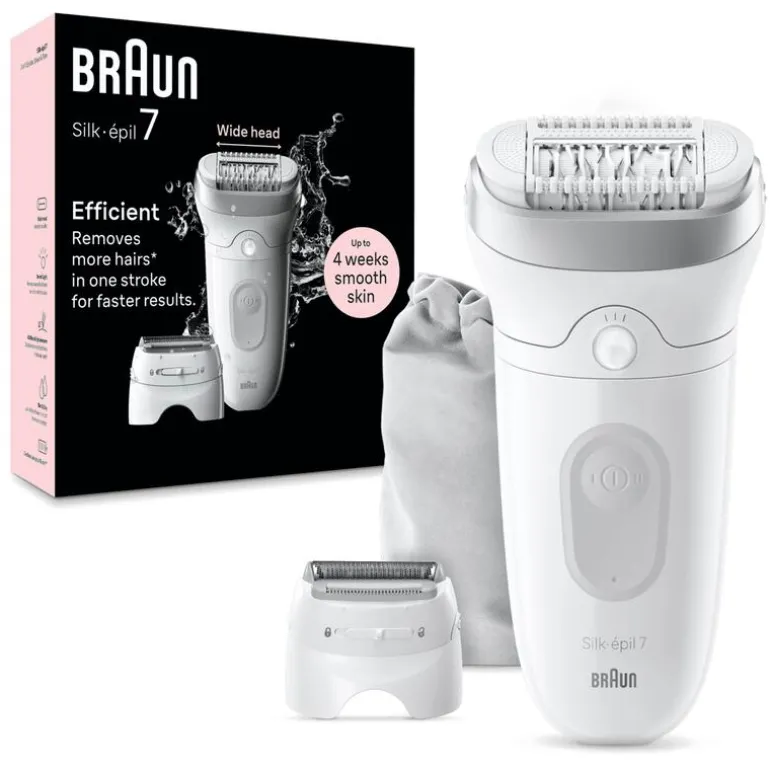 De Braun Silk·épil 7 zorgt op elk moment en op een efficiënte manier voor tot wel 1 maand lang een gladde huid. Deze Wet & Dry-epilator met brede kop kan grotere zones bereiken, waarbij meer haar in elke beweging wordt verwijderd (in vergelijking met de Braun Silk·épil 5). Deze draadloze Braun-epilator heeft MicroGrip-pincettechnologie, die haartjes tot 0,5 mm verwijdert. Geniet van een salonzachte huid met extra comfort dankzij het massagerolleropzetstuk dat de pijnsensatie kan verminderen. Niet meer wachten op het terug groeien van haar, wat bij andere haarverwijderingsproducten zoals wax is vereist. Deze epilator is gemaakt voor gebruiksgemak en elimineert de noodzaak voor (tussen)afspraken.