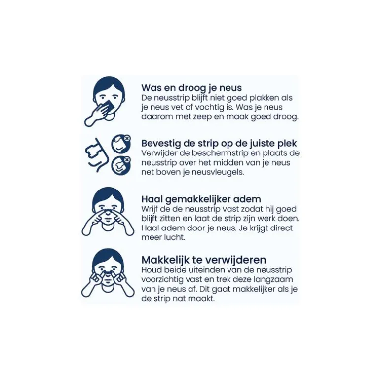 De huidvriendelijke kleefstrip bevat twee buigzame strookjes, waarmee je de strip eenvoudig over de neusbrug plakt. De strip tilt de neusvleugels extra stevig op, waardoor de neusgangen zich openen en je direct meer lucht krijgt. Deze verbeterde luchtstroom kan snurken door een verstopte neus helpen verminderen of zelfs helemaal laten verdwijnen.