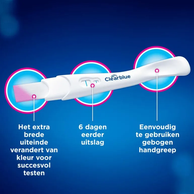 Lees altijd eerst de bijsluiter van uw medicijnen voordat u een test uitvoert. Een onterechte positieve uitslag kan worden veroorzaakt door medicatie die hCG bevat en door bepaalde zeldzame medische aandoeningen. Een buitenbaarmoederlijke of recente zwangerschap (zelfs als de zwangerschap niet is voldragen) kan misleidende uitslagen opleveren. Als u (bijna) in de menopauze bent, kan u ook een onterechte uitslag Zwanger krijgen terwijl u niet zwanger bent. De test zou NIET moeten worden beïnvloed door hormoonbehandelingen met clomifeencitraat, reguliere pijnstillers, alcohol, antibiotica of de anticonceptiepil. Als u een onverwachte uitslag krijgt, dient u deze te bespreken met uw huisarts. *Laat u weten hoeveel weken (Clearblue digitale zwangerschapstest met wekenindicator): het aantal weken na bevruchting wordt afgebeeld als 1-2, 2-3 of 3+. *De test met de snelste uitslag (Clearblue ultravroege zwangerschapstest): 79% van de uitslag Zwanger kan 6 dagen voor uw gemiste menstruatie worden gedetecteerd. *Het meest verkochte merk van zwangerschaps- en vruchtbaarheidstesten voor thuisgebruik ter wereld. Gebaseerd op internationale verkoopcijfers in bijna 20 landen, verzameld met behulp van onafhankelijke marktonderzoeksgegevens. *Meer dan 99% nauwkeurig: meer dan 99% nauwkeurig bij het detecteren van zwangerschap vanaf de dag dat uw menstruatie zou moeten beginnen (Clearblue zwangerschapstesten). Meer dan 99% nauwkeurig bij het detecteren van de LH-piek (Clearblue ovulatietesten). 99% nauwkeurig bij het detecteren van de LH-piek (Clearblue geavanceerde vruchtbaarheidsmonitor). *Clearblue is veruit het nauwkeurigst: meer dan 99% nauwkeurig bij het detecteren van zwangerschap vanaf de dag dat uw menstruatie zou moeten beginnen (Clearblue zwangerschapstesten). Meer dan 99% nauwkeurig in het detecteren van de LH-toename (Clearblue ovulatietesten). *Net zo nauwkeurig als een echo om te zien hoelang u zwanger bent (Clearblue digitale zwangerschapstest met wekenindicator): weken komt in 97% overeen met de uitslag van latere echo-onderzoeken. Dit is op basis van een onderzoek onder 187 vrouwen waarbij het aantal weken werd vergeleken met een echo-onderzoek. *Snelle uitslag na 1 minuut (Clearblue zwangerschapstest met snelle detectie en Clearblue Flip & Click zwangerschapstest): de uitslag Zwanger kan vanaf de dag van de gemiste menstruatie al na 1 minuut verschijnen. Wacht 3 minuten om de uitslag Niet Zwanger te bevestigen. *Uitslagen 6 dagen voor uw gemiste menstruatie (Clearblue ultravroege zwangerschapstest): 79% van de uitslag Zwanger kan 6 dagen voor uw gemiste menstruatie worden gedetecteerd. *Uitslagen 6 dagen voor uw gemiste menstruatie (Clearblue digitale ultravroege zwangerschapstest): 78% van de uitslag Zwanger kan 6 dagen voor uw gemiste menstruatie worden gedetecteerd. *Uitslagen 6 dagen voor uw gemiste menstruatie (Clearblue ultravroege GEAVANCEERDE zwangerschapstest): 77% van de uitslag Zwanger kan 6 dagen voor uw gemiste menstruatie worden gedetecteerd. *Uitslagen 5 dagen voor uw gemiste menstruatie (Clearblue digitale zwangerschapstest met wekenindicator): 80% van de uitslag Zwanger kan 5 dagen voor uw gemiste menstruatie worden gedetecteerd. SPD Swiss Precision Diagnostics GmbH, Route de St Georges 47, 1213 Petit-Lancy, Genève, Zwitserland. BE: 0800 815 46. NL: 0800 394 9031. www.clearblue.com. Naam en adres van de gemachtigde vertegenwoordiger: MDSS GmbH, Schiffgraben 41 Hannover 30175, Duitsland: [email protected].