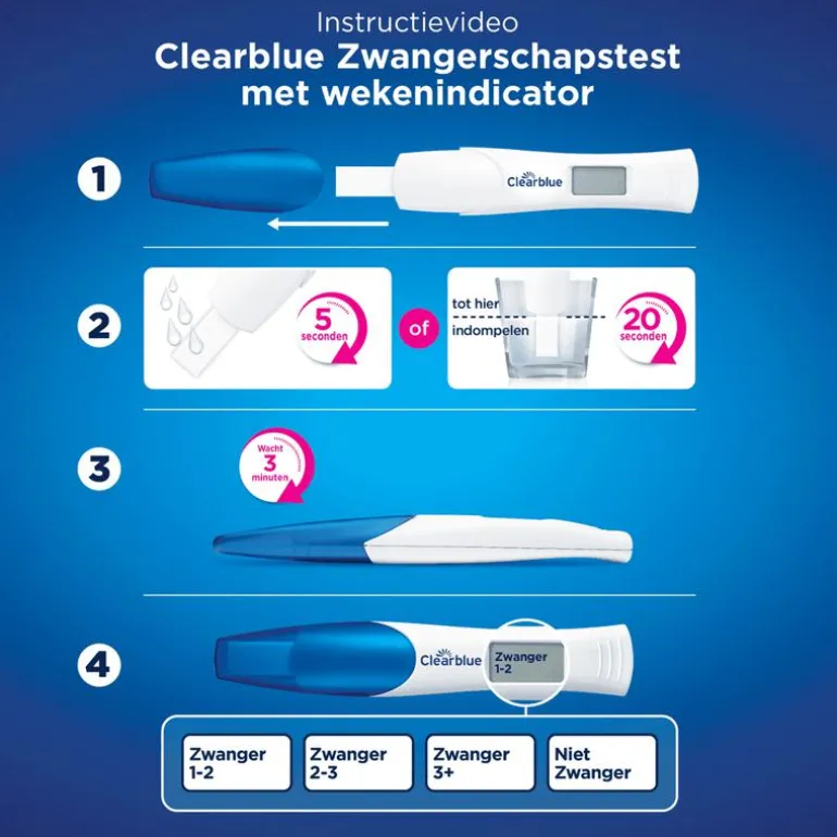 Lees altijd eerst de bijsluiter van uw medicijnen voordat u een test uitvoert. Een onterechte positieve uitslag kan worden veroorzaakt door medicatie die hCG bevat en door bepaalde zeldzame medische aandoeningen. Een buitenbaarmoederlijke of recente zwangerschap (zelfs als de zwangerschap niet is voldragen) kan misleidende uitslagen opleveren. Als u (bijna) in de menopauze bent, kan u ook een onterechte uitslag Zwanger krijgen terwijl u niet zwanger bent. De test zou NIET moeten worden beïnvloed door hormoonbehandelingen met clomifeencitraat, reguliere pijnstillers, alcohol, antibiotica of de anticonceptiepil. Als u een onverwachte uitslag krijgt, dient u deze te bespreken met uw huisarts. Bij meerlingzwangerschappen en buitenbaarmoederlijke zwangerschappen kan de wekenindicator een verkeerde uitslag geven. Dit digitale IVD-apparaat voldoet aan de vereisten voor emissie en immuniteit van EN 61326-2-6. De EMC-tegenmaatregelen die in dit elektronische instrument zijn gebruikt, geven een redelijke bescherming tegen de effecten van elektromagnetische interferentie die vaak in de thuisomgeving voorkomt. De volgende preventieve waarschuwingen zijn van toepassing op apparatuur die voldoet aan EN 61326-2-6. a) Gebruik van dit instrument in een droge omgeving, vooral als er synthetische materialen aanwezig zijn (synthetische kleding, tapijten enz.) kan schadelijke statische ontladingen veroorzaken die foutieve uitslagen kunnen veroorzaken. b) Gebruik dit instrument niet in de nabijheid van bronnen van sterke elektromagnetische straling (bijv. mobiele telefoons), omdat deze de juiste werking kunnen verstoren. *Laat u weten hoeveel weken (Clearblue digitale zwangerschapstest met wekenindicator): het aantal weken na bevruchting wordt afgebeeld als 1-2, 2-3 of 3+. *Net als 2 testen in 1 (Clearblue digitale zwangerschapstest met wekenindicator): vertelt u of u zwanger bent en hoe ver u bent. *Het meest verkochte merk van zwangerschaps- en vruchtbaarheidstesten voor thuisgebruik ter wereld. Gebaseerd op internationale verkoopcijfers in bijna 20 landen, verzameld met behulp van onafhankelijke marktonderzoeksgegevens. *Meer dan 99% nauwkeurig: meer dan 99% nauwkeurig bij het detecteren van zwangerschap vanaf de dag dat uw menstruatie zou moeten beginnen (Clearblue zwangerschapstesten). Meer dan 99% nauwkeurig bij het detecteren van de LH-piek (Clearblue ovulatietesten). 99% nauwkeurig bij het detecteren van de LH-piek (Clearblue geavanceerde vruchtbaarheidsmonitor). *Clearblue is veruit het nauwkeurigst: meer dan 99% nauwkeurig bij het detecteren van zwangerschap vanaf de dag dat uw menstruatie zou moeten beginnen (Clearblue zwangerschapstesten). Meer dan 99% nauwkeurig in het detecteren van de LH-toename (Clearblue ovulatietesten). *Net zo nauwkeurig als een echo om te zien hoelang u zwanger bent (Clearblue digitale zwangerschapstest met wekenindicator): weken komt in 97% overeen met de uitslag van latere echo-onderzoeken. Dit is op basis van een onderzoek onder 187 vrouwen waarbij het aantal weken werd vergeleken met een echo-onderzoek. *Snelle uitslag na 1 minuut (Clearblue zwangerschapstest met snelle detectie en Clearblue Flip & Click zwangerschapstest): de uitslag Zwanger kan vanaf de dag van de gemiste menstruatie al na 1 minuut verschijnen. Wacht 3 minuten om de uitslag Niet Zwanger te bevestigen. *Uitslagen 6 dagen voor uw gemiste menstruatie (Clearblue ultravroege zwangerschapstest): 79% van de uitslag Zwanger kan 6 dagen voor uw gemiste menstruatie worden gedetecteerd. *Uitslagen 6 dagen voor uw gemiste menstruatie (Clearblue digitale ultravroege zwangerschapstest): 78% van de uitslag Zwanger kan 6 dagen voor uw gemiste menstruatie worden gedetecteerd. *Uitslagen 6 dagen voor uw gemiste menstruatie (Clearblue ultravroege GEAVANCEERDE zwangerschapstest): 77% van de uitslag Zwanger kan 6 dagen voor uw gemiste menstruatie worden gedetecteerd. *Uitslagen 5 dagen voor uw gemiste menstruatie (Clearblue digitale zwangerschapstest met