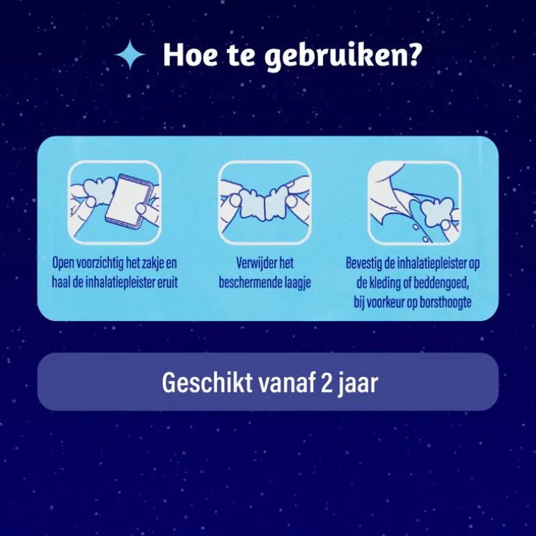 Dosering: Niet meer dan één inhalatiepleister tegelijk gebruiken. Eén inhalatiepleister per nacht is voldoende om vrijer te kunnen ademen. Direct aanbrengen op de (droge) kleding, bijvoorbeeld op de pyjama. Op borsthoogte aanbrengen. De inhalatiepleister is gemakkelijk te bevestigen en te verwijderen.