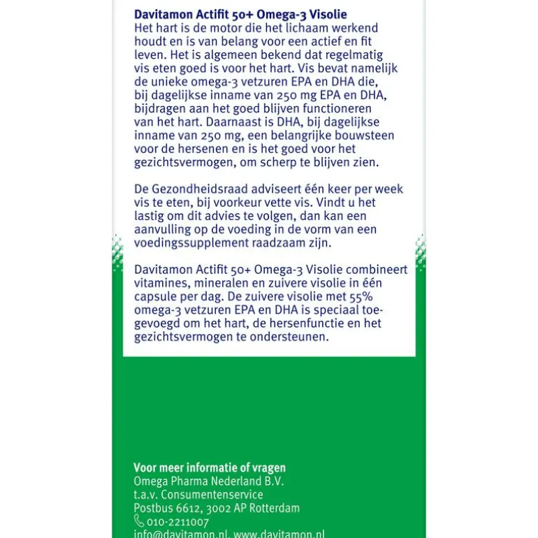 Davitamon Actifit 50+ Omega-3 Visolie is speciaal ontwikkeld voor volwassenen vanaf 50 jaar en voorziet in de dagelijkse aanvulling van vitamines en mineralen. Hierdoor is Davitamon Actifit 50+ Omega-3:
