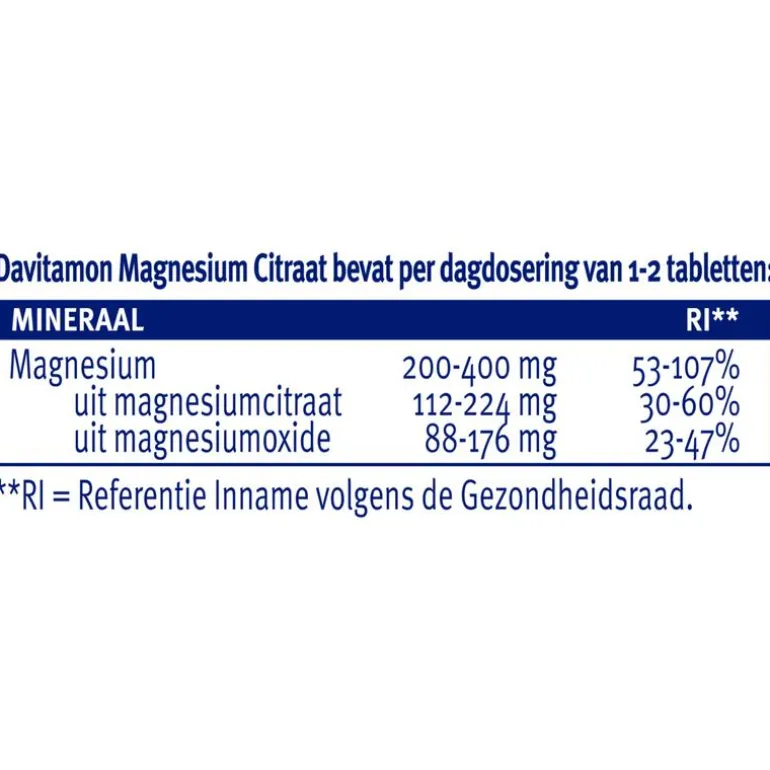 Davitamon Magnesium citraat VOORDEELVERPAKKING. Magnesium speelt een essentiële rol bij verschillende lichaamsfuncties. Het is onder andere belangrijk voor de energiestofwisseling, speelt een rol bij het behoud van sterke spieren en botten en draagt bij tot de vermindering van vermoeidheid. *Davitamon magnesiumcitraat bevat een combinatie van magnesiumcitraat en magnesiumoxide. Magnesiumcitraat is een organische vorm van magnesium met een hoge biiologische beschikbaarheid en is dus goed opneembaar.. Davitamon magnesiumcitraat bevat een hoge dosering magnesium in een kleine, gemakkelijk in te nemen tablet.
