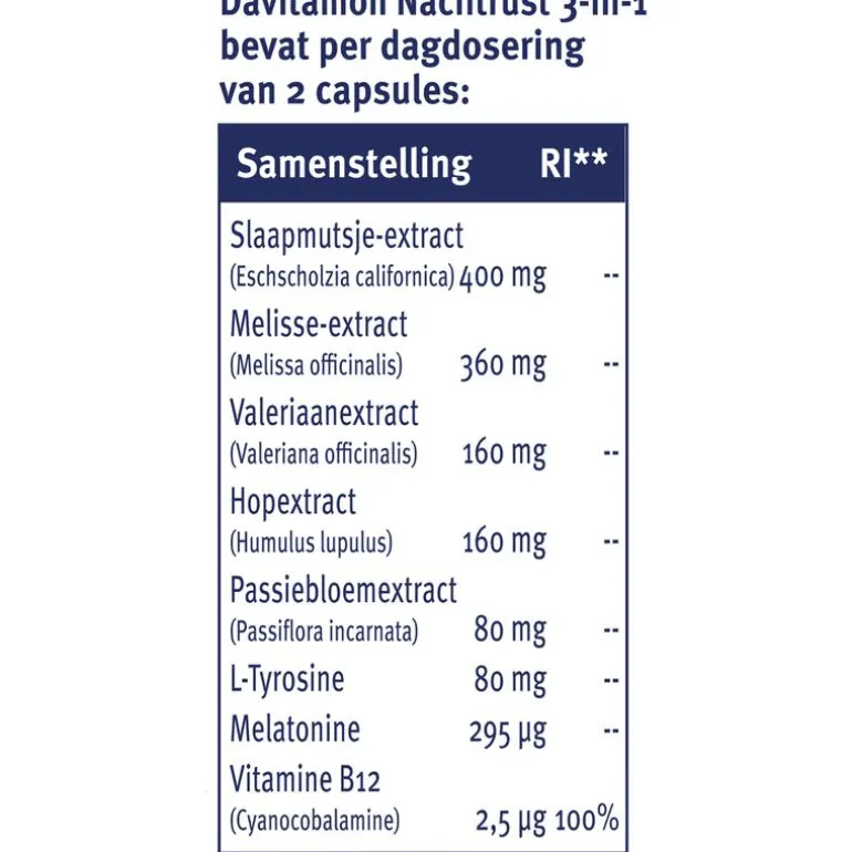 Davitamon Nachtrust 3-in-1 ondersteunt in 3 verschillende aspecten van het behoud van een goede nachtrust: het helpt om sneller in slaap te vallen, is goed voor de slaapkwaliteit en helpt om uitgerust wakker te worden. De formule bevat hiervoor een combinatie van natuurlijke extracten van valeriaan, passiebloem, slaapmutsje, hop en melisse.