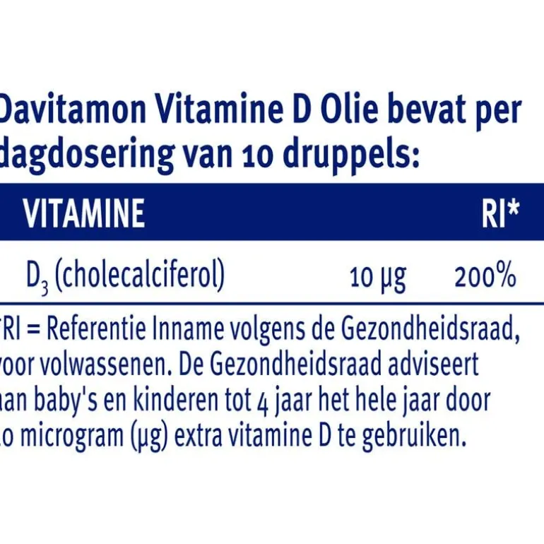 Davitamon D Olie voor Baby en Kind is een voedingssupplement speciaal ontwikkeld voor baby’s en kinderen. Deze groepen ontwikkelen zich supersnel en hebben daarom extra hulp nodig. Davitamon D Olie voor Baby en Kind bevat vitamine D3, 200% van de ADH, en is hierdoor: