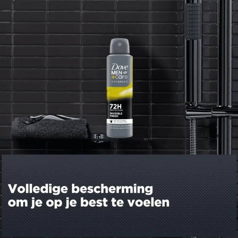 Maak je geen zorgen over witte strepen en gele vlekken met Dove Men+Care Advanced Invisible Fresh Anti-Transpirant Deodorant Spray.