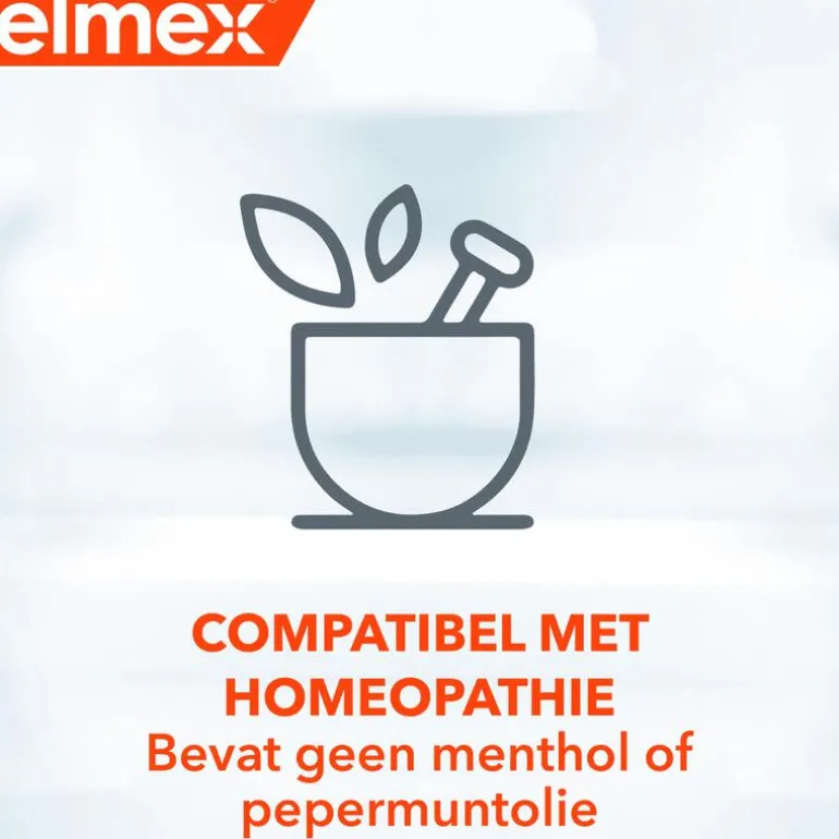 De elmex® Anti-Cariës Mentholvrij Tandpasta met zijn unieke aminfluoride formule bevat geen menthol of pepermunt olie en kan daarom worden gecombineerd met een homeopathische behandeling. De tandpasta helpt de tanden te beschermen tegen cariës.