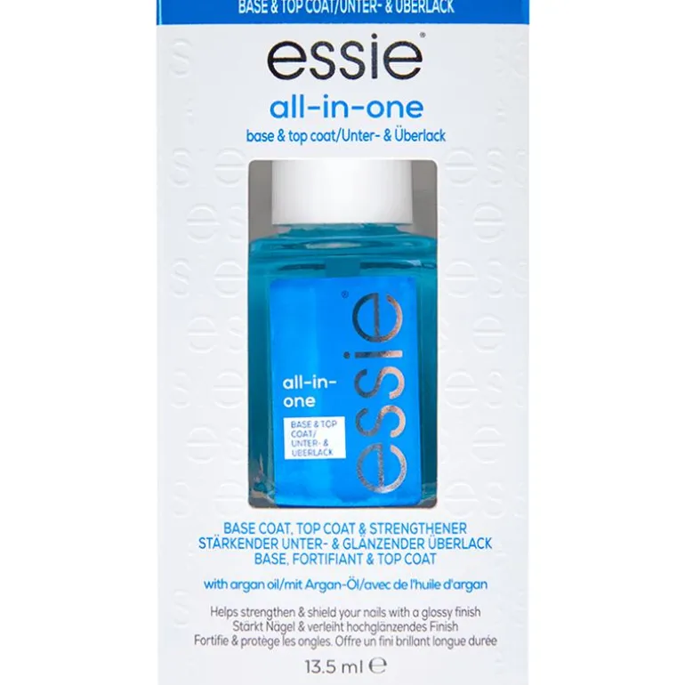 essie all-in-one base coat en topcoat is een nagelverzorgingsproduct die de nagels versterkt en daarbij een glanzende finish geeft. De all-in-one formule met arganolie helpt de nagellak beter te laten hechten aan de nagel en verzorgt de nagels. De 2-in-1 basecoat en topcoat is daarom ideaal om jouw manicure te versimpelen. Ook handig voor onderweg of op reis!