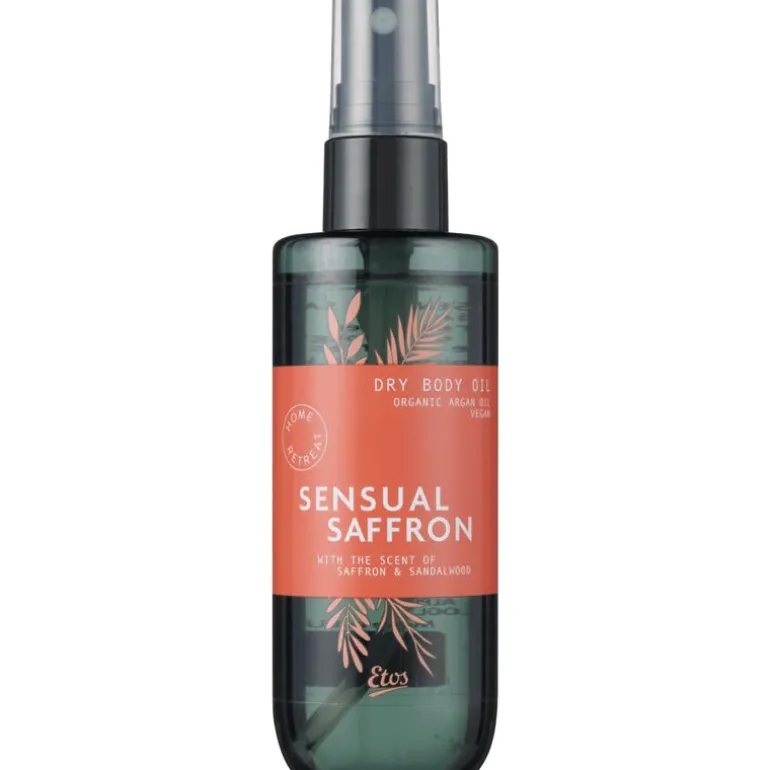 Etos Sensual Saffron Dry body oil 100 ml is een snel absorberende droge olie met organic arganolie. De olie voedt de huid en geeft een zijdezacht resultaat. Geniet van de warme geur van saffraan en sandelhout.