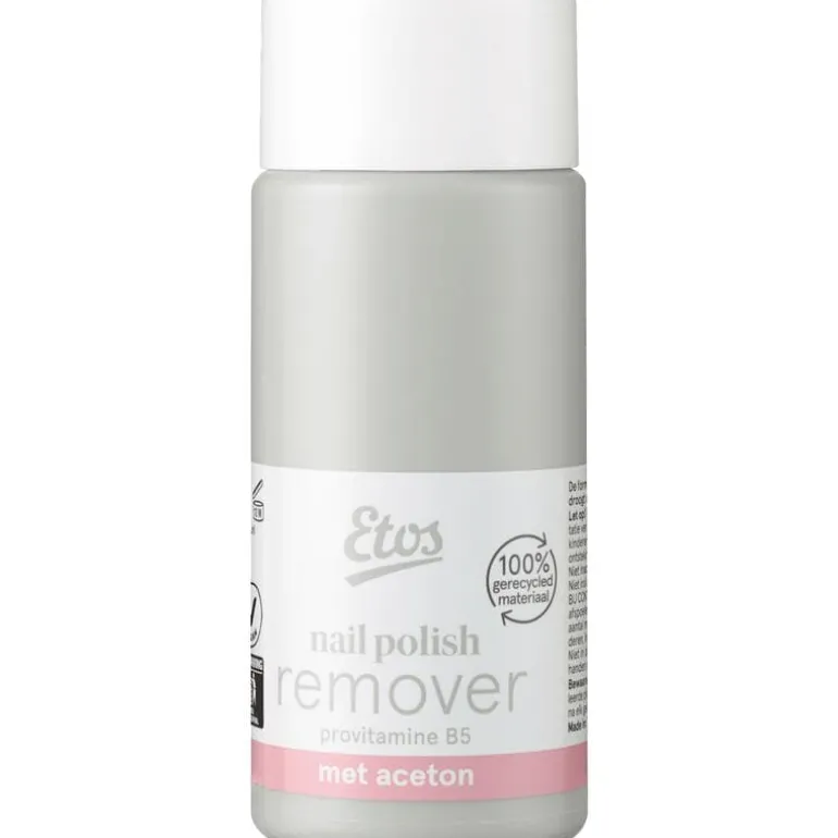 Etos Nail polish remover met aceton 150 ml verwijdert moeiteloos nagellak. De nail polish remover verwijdert snel en efficiënt alle soorten nagellak. De remover bevat provitamine B5 en droogt de nagels niet uit.