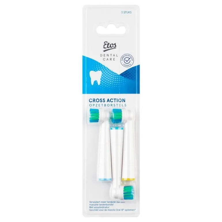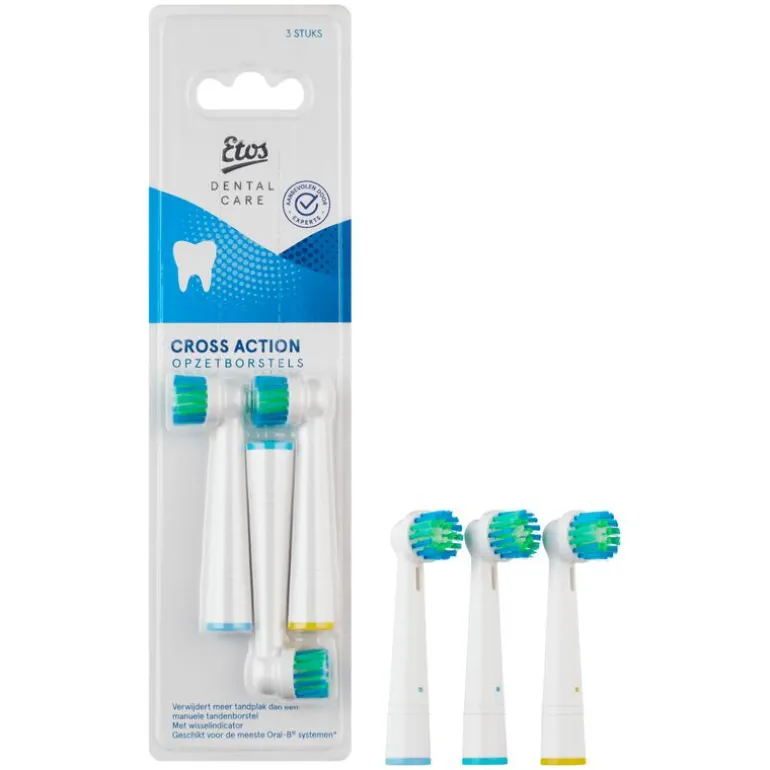 Etos Cross action opzetborstels voor elektrisch poetsen zijn speciaal ontwikkeld om het gebit optimaal te reinigen.
