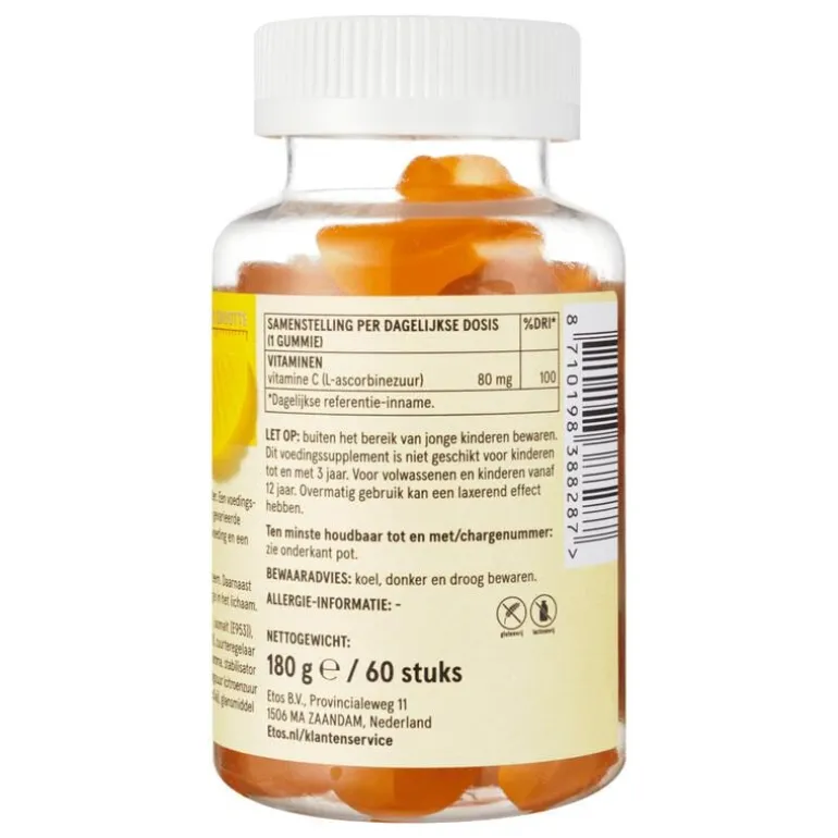 Etos Vitamine C gummies met citroensmaak. Vitamine C ondersteunt het immuunsysteem. Daarnaast activeert vitamine C de natuurlijke energie in het lichaam. Voedingssupplement met zoetstoffen.