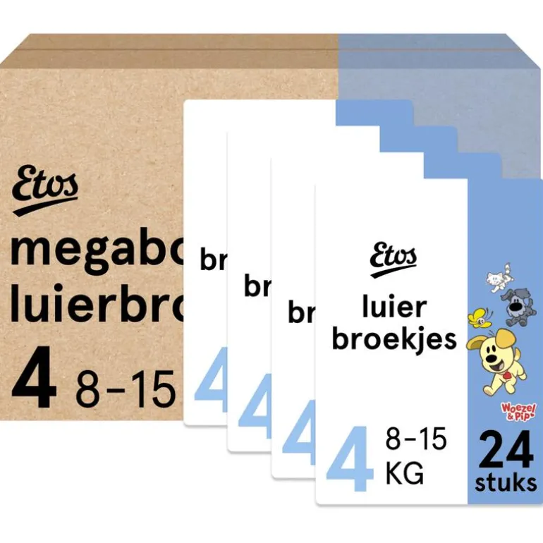 Etos Woezel & Pip Luierbroekjes Maxi 4 hebben een exclusief Woezel & Pip design. In de verpakking zitten luiers met 2 verschillende soorten designs.