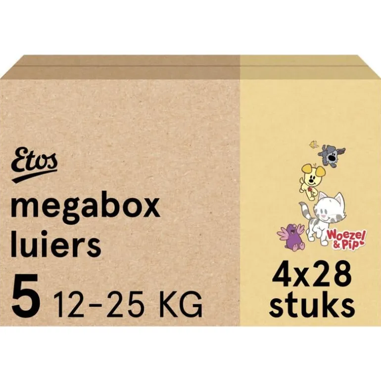 • Woezel & Pip design. Etos Woezel & Pip Luiers hebben een exclusief Woezel & Pip design. In de verpakking zitten 2 verschillende soorten designs.