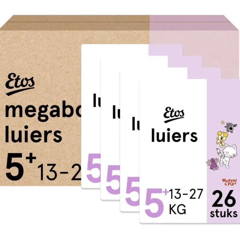 • Woezel & Pip design. Etos Woezel & Pip Luiers hebben een exclusief Woezel & Pip design. In de verpakking zitten 2 verschillende soorten designs.