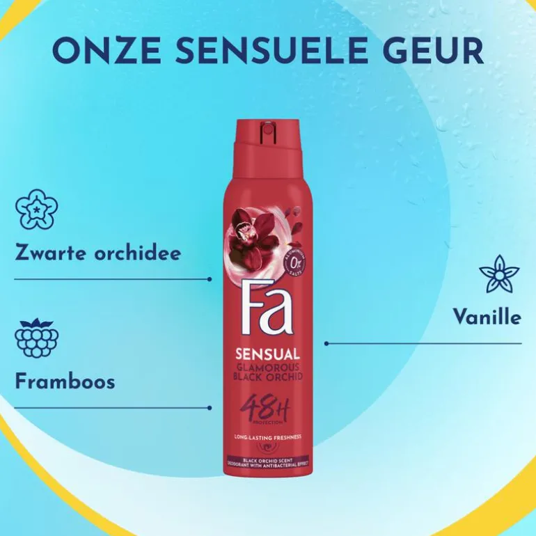Ontdek Fa Glamorous Black Orchid deodorant spray met de geur van zwarte orchidee. De vegan formule biedt 48 uur bescherming tegen nare geurtjes en is vrij van aluminiumzouten.