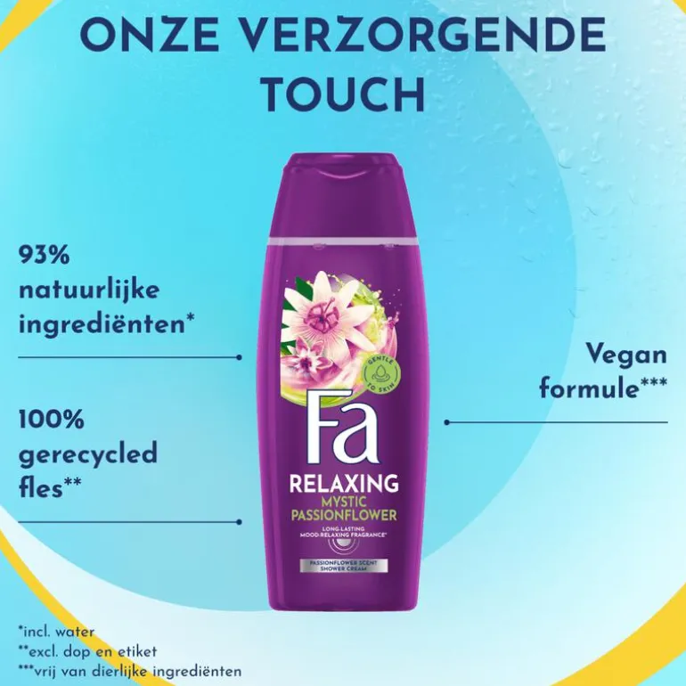 Ontdek Fa Mystic Passionflower douchecrème met de geur van passiebloem. De vegan formule bevat 95% ingrediënten van natuurlijke oorsprong (incl. water).