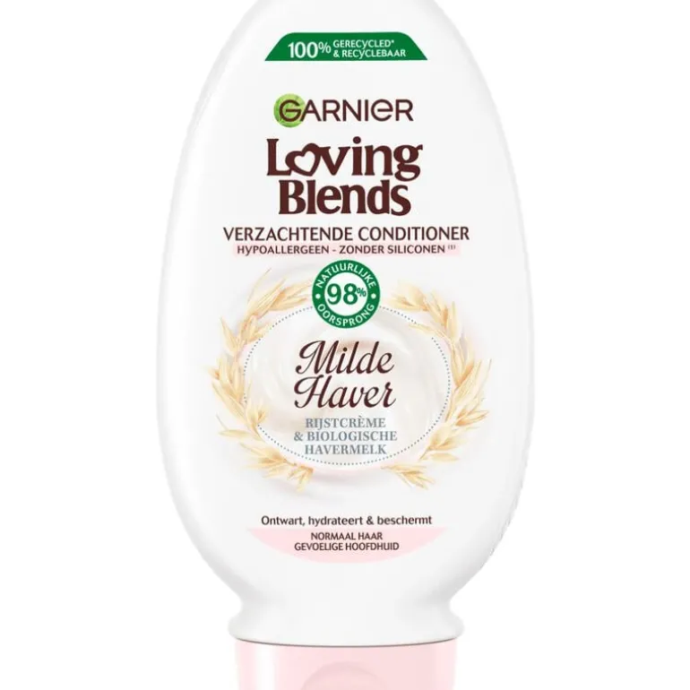 De Loving Blends Milde Haver Conditioner van Garnier is een hypoallergene conditioner (ECARF gecertificeerd) van 97% natuurlijke oorsprong, speciaal ontwikkeld voor normaal haar en een gevoelige hoofdhuid. De conditioner ontwart, hydrateert en verzacht het haar en beschermt het haar over de gehele lengte. Garnier Loving Blends heeft een formule samengesteld die twee zachte ingrediënten combineert: – Rijstcrème, bekend om zijn hydraterende en beschermende werking op het haar – Biologische havermelk, gebruikt om de gevoelige huid te verzorgen en bekend om de kalmerende en verzachtende werking op de gevoelige hoofdhuid. Het haar is eenvoudig in model te brengen, soepel, glanzend, zijdezacht en beschermd over de gehele lengte. Formule zonder siliconen, voor een natuurlijk gevoel en zonder dierlijke ingrediënten & bijproducten in een 100% gerecyclede en recyclebare fles. Loving Blends is gecertificeerd door Cruelty Free International. Ontdek voor nog meer verzorging ook de bijhorende shampoo en het haarmasker.