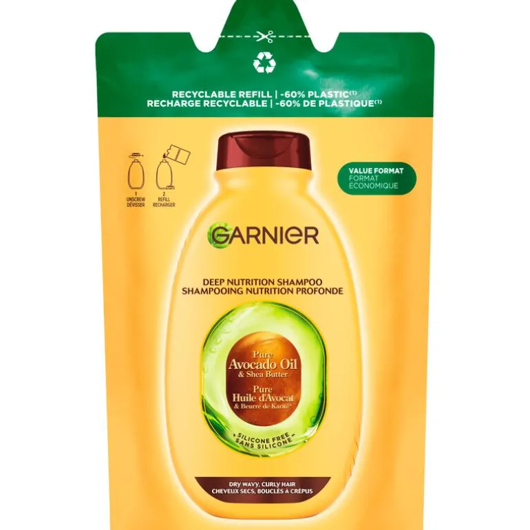 Minder plastic*, m€€r voordeel. Word ook een shampoo refiller! Garnier Loving Blends Avocado Olie & Shea Boter Shampoo Refill is jouw vertrouwde shampoo, maar nu hervulbaar. Garnier Loving Blends Avocado Olie & Shea Boter Shampoo Refill reinigt mild, voedt en verzacht krullen zonder te verzwaren. De iconische formule van Garnier Loving Blends Avocado Olie & Shea Boter shampoo is speciaal ontwikkeld voor zeer droog, golvend of krullend haar en is nu verrijkt met 10x meer geconcentreerd Avocado Olie**. Het haar is intens gevoed tot wel 6 weken***, zachter en gemakkelijker te stijlen en geschikt voor alle verschillende type krullen. *Deze Shampoo Refill is gemaakt van 60% minder plastic in vergelijking met het gebruik van onze 250ml fles shampoo. **Vs vorige formule. ***Gebaseerd op een 250ml fles en 3 gebruiken per week. Kan verschillen op basis van gebruik en lengte van het haar.