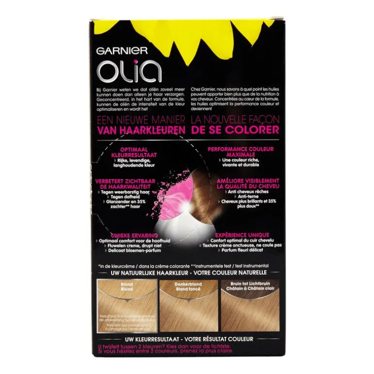 Garnier Olia is een permanente haarkleuring op basis van oliën, biedt tot 100% grijsdekking zonder ammoniak voor een aangename geur. Door de mix van oliën met natuurlijke bloemen die zijn toegevoegd aan de kleurcrème, dringen de kleurpigmenten tot dieper in je haar. Dit zorgt voor optimaal resultaat en zichtbare verbetering van haarkwaliteit. De verpakking bevat kleurcrème, ontwikkelcrème, nabehandeling, handschoenen en gebruiksaanwijzing. De fluweelzachte textuur maakt thuisapplicatie eenvoudig, terwijl de nabehandeling zonder siliconen het haar natuurlijk laat aanvoelen, met langdurige glans en verzorging.