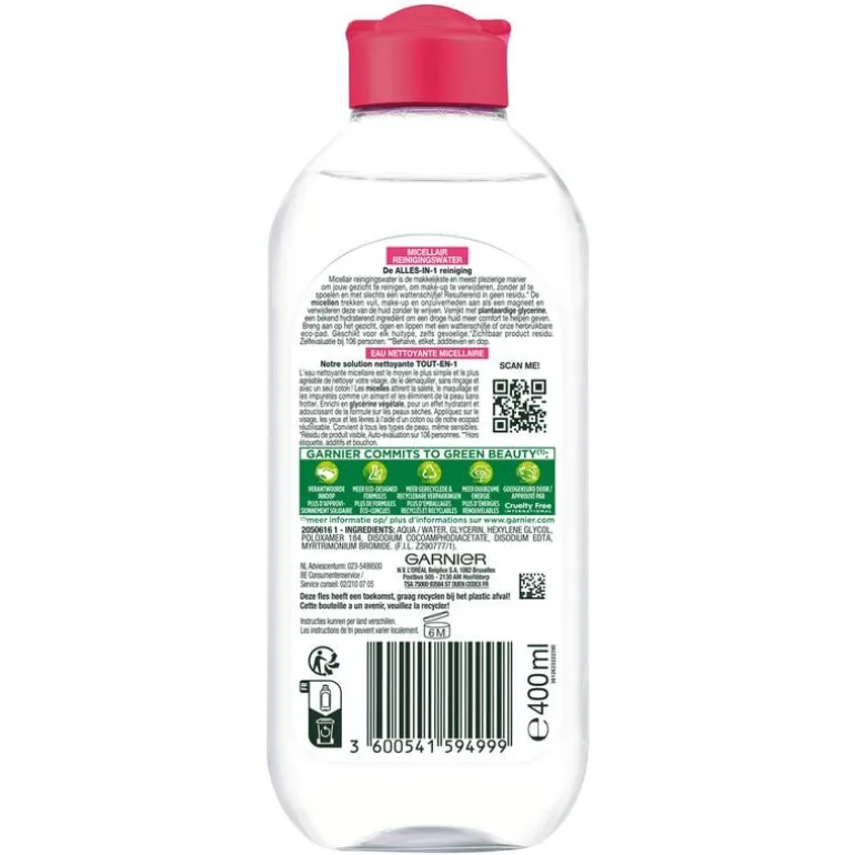 Deze geurloze formule van Garnier Micellair Reinigingswater is geschikt voor een droge huid. Het micellair water is verrijkt met micellen die afkomstig zijn uit de farmacie. Het zijn reinigende deeltjes die als een magneet onzuiverheden, make-up en talg op de huid aantrekken en zo van de huid verwijderen, zonder te wrijven. Speciaal om een trekkerige en droge huid tegen te gaan. Het Micellair reinigingswater is verrijkt met hydraterende glycerine. Na gebruik ’s ochtends en ’s avonds is je huid gereinigd, verzacht en is make-up verwijderd.