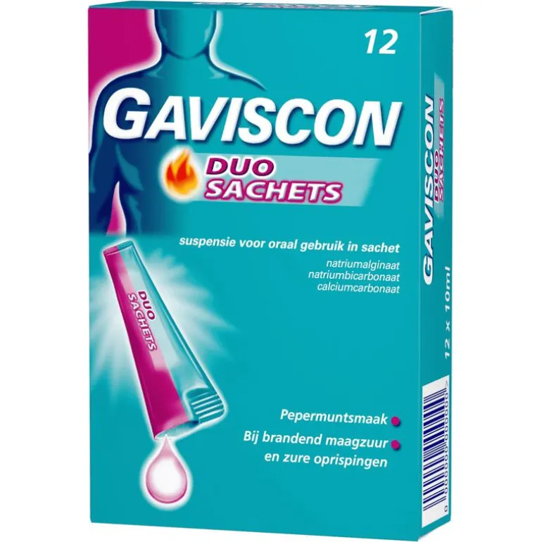 GAVISCON Duo Sachets zijn werkzaam bij brandend maagzuur en zure oprispingen.Elk sachet van 10 ml bevat 500 mg natriumalginaat, 213 mg natriumbicarbonaat en 325 mg calciumcarbonaat.Dosering en wijze van gebruik: Voor oraal gebruik. Voor gebruik de bijsluiter lezen.Volwassenen en kinderen vanaf 12 jaar: 10 tot 20 ml (één tot twee sachets) na de maaltijden en vóór het slapengaan, of volgens de instructies van uw arts, tot maximaal vier keer per dag. Kinderen jonger dan 12 jaar: uitsluitend op medisch advies.BUITEN HET ZICHT EN BEREIK VAN KINDEREN HOUDEN.Niet gebruiken bij overgevoeligheid voor één van de bestanddelen. Bevat natrium en calcium. Als u een natrium- of calciumarm dieet volgt, raadpleeg dan uw arts voordat u dit product gebruikt. Raadpleeg uw arts als de klachten na 7 dagen aanhouden. Bevat natrium, methylparahydroxybenzoaat (E218) en propylparahydroxybenzoaat (E216). Lees de bijsluiter voor verdere informatie. Spoel geneesmiddelen niet door de gootsteen of de WC en gooi ze niet in devuilnisbak. Vraag uw apotheker wat u met geneesmiddelen moet doen die niet meer nodig zijn. Ze worden dan op een verantwoorde manier vernietigd en komen niet in het milieu.