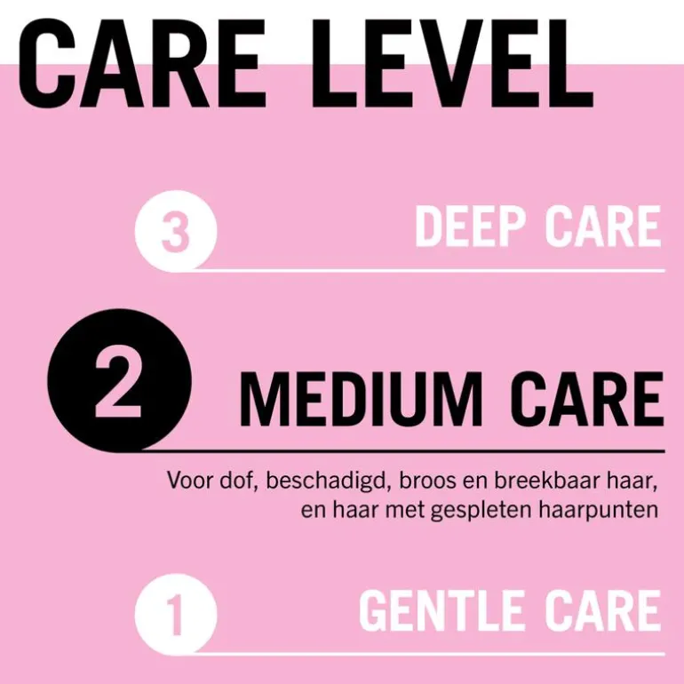 - Gliss Care Level: 2 – Medium verzorging, met een uitgebalanceerde samenstelling van voedende ingrediënten.