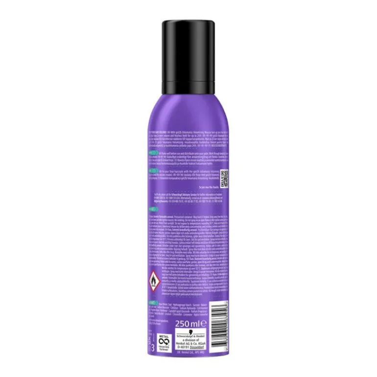 De flacon voor gebruik goed schudden. Neem een beetje mousse in je handen en breng aan op vochtig haar. Nadien het haar föhnen en stylen. Gevaar! Zeer licht ontvlambare aerosol. Houder onder druk: kan openbarsten bij verhitting. Verwijderd houden van warmte, hete oppervlakken, vonken, open vuur en andere ontstekingsbronnen. Niet roken. Niet in een open vuur of op andere ontstekingsbronnen spuiten. Ook na gebruik niet doorboren of verbranden. Tegen zonlicht beschermen. Niet blootstellen aan temperaturen boven 50°C. Buiten het bereik van kinderen houden. Alleen gebruiken in goed geventileerde ruimtes. Gelieve enkel volledig lege verpakkingen bij het recyclebaar afval te zetten.