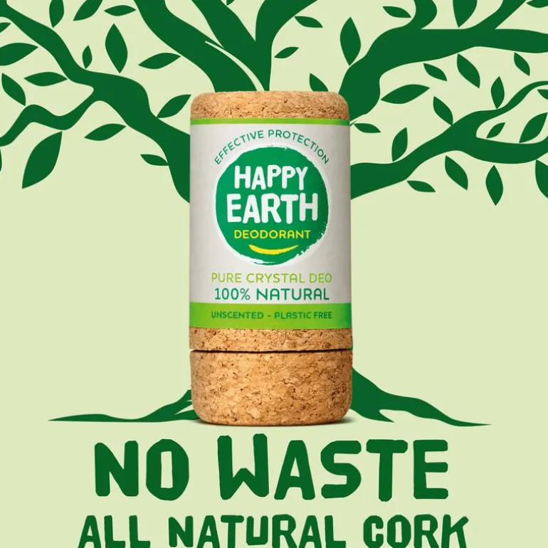 HAPPY EARTH Pure Deodorant Crystal Unscented is een geurloze en hypoallergene deo vermengd met een vleugje vrolijkheid: pure aluinsteen met een verpakking gemaakt van kurk – een 100% natuurlijke, duurzame en zero waste verpakking: plasticvrij en biologisch afbreekbaar.