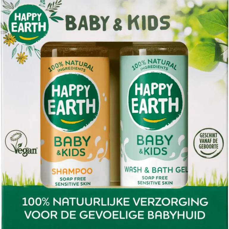 De Happy Earth Baby & Kids Starter Pack 2x100ml is het perfecte kraamcadeau of gewoon lekker voor thuis. Deze set bevat twee must-haves: een 100ml Shampoo en een 100ml Was & Badgel speciaal voor de gevoelige huid van baby’s en kinderen. De producten bevatten alleen 100% natuurlijke ingrediënten die zijn gecertificeerd door NATRUE. Ze bevatten geen SLS/SLES, microplastics, parabenen of andere nare toevoegingen. De producten hebben een heerlijk 100% natuurlijk parfum en de flessen zijn gemaakt van 100% gerecycled plastic. Zo zorg je niet alleen goed voor de huid van jouw baby, maar ook voor de toekomst van onze aarde!