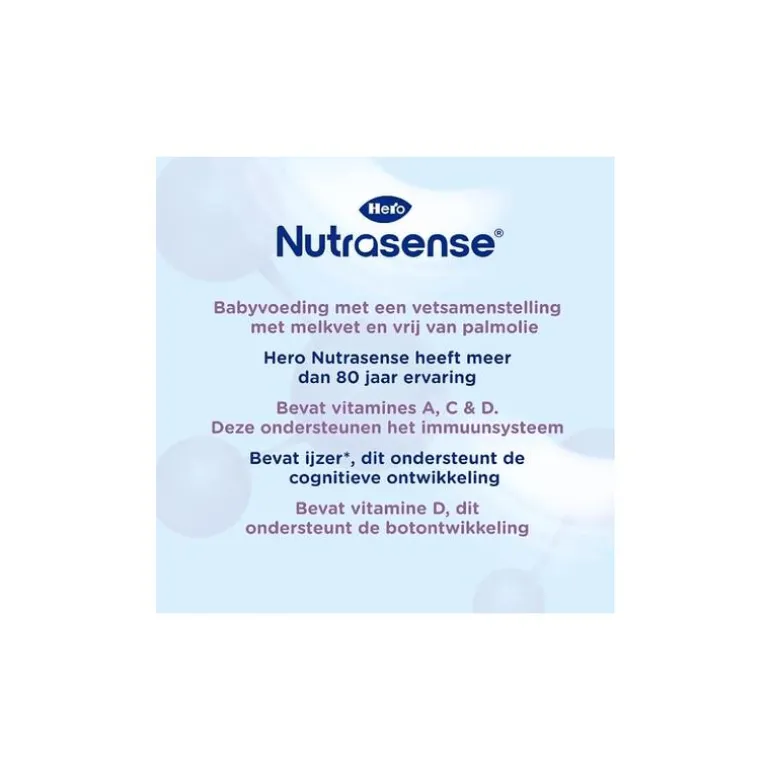Hero Nutrasense 2 bevat, zoals alle opvolgmelk, vitamines A, C & D en ijzer,¹Bevat zoals alle opvolgmelk vitamines A, C en D welke het behoud van de weerstand ondersteunen. ²Bevat zoals alle opvolgmelk ijzer en ijzer ondersteunt de cognitieve ontwikkeling. ³Bevat zoals alle opvolgmelk vitamine D, dit ondersteunt de botontwikkeling.