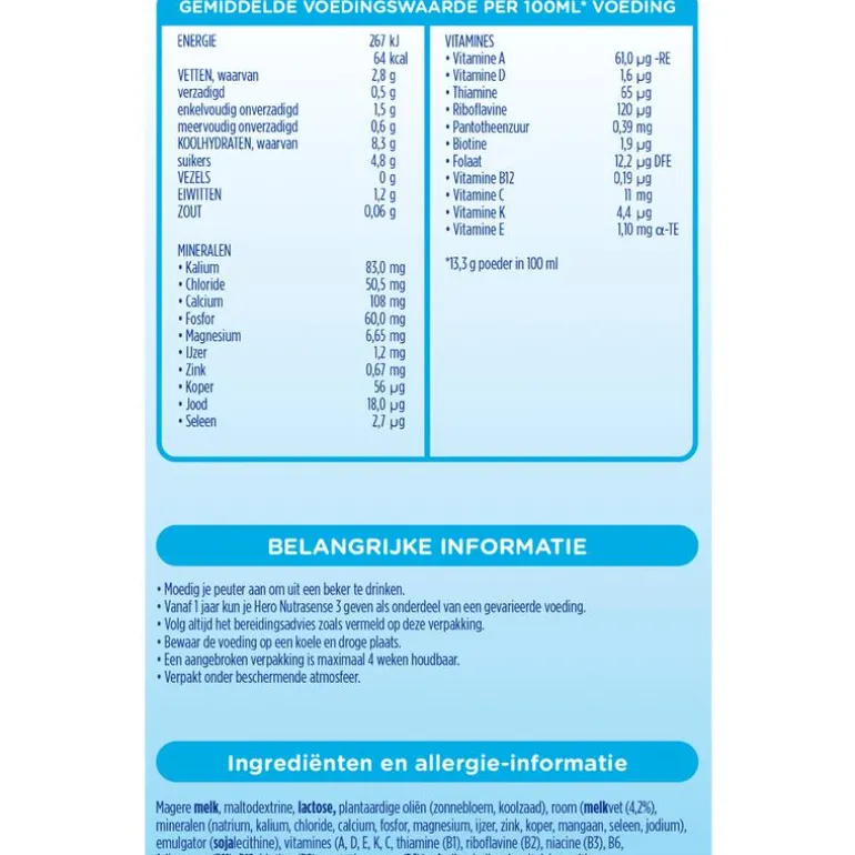 Belangrijke informatie • Vanaf 1 jaar kun je Hero Nutrasense 3 geven als onderdeel van een gevarieerde voeding. • Volg altijd het bereidingsadvies zoals vermeld op deze verpakking. • Overleg voor gebruik met je consultatiebureau of arts. • Verpakt onder beschermende atmosfeer.
