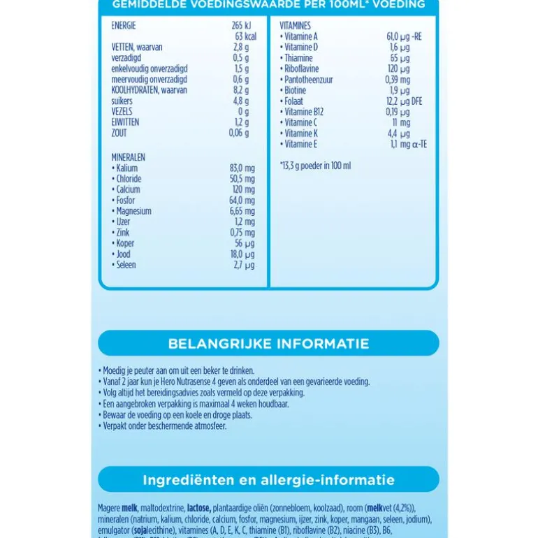 Belangrijke informatie. • Vanaf 2 jaar kun je Hero Nutrasense 4 geven als onderdeel van een gevarieerde voeding. • Volg altijd het bereidingsadvies zoals vermeld op deze verpakking.• Overleg voor gebruik met je consultatiebureau of arts. • Verpakt onder beschermende atmosfeer.