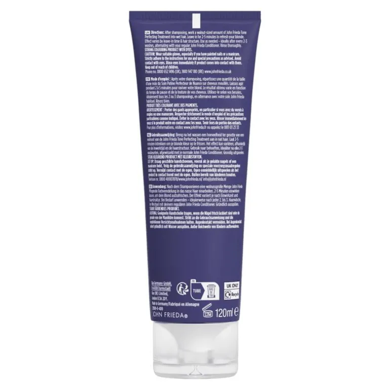 3X Blondecare: verlichten, voeden en beschermen*. De John Frieda Go Blonder Shampoo reinigt het haar en helpt het op te lichten voor een heldere, natuurlijk ogende blonde tint. De shampoo met Citrus Botanical Blend geeft glans en is veilig voor gebruik op natuurlijk blond haar, gekleurd blond haar, highlights en lowlights. Niet aanbevolen voor platina of koelere blondtinten. *bij gebruik van de Go Blonder Shampoo, Conditioner & Spray
