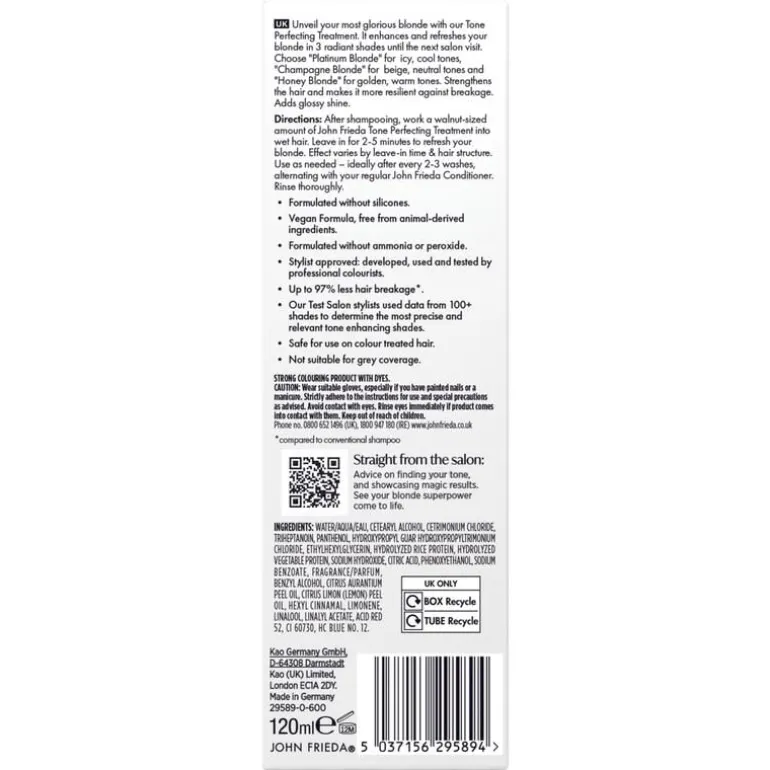 - •Samengesteld zonder siliconen. •Vegan formule, vrij van dierlijke ingrediënten. •Geschikt voor blond haar. •Met Citrus Botanical Blend. •Niet aanbevolen voor platina of koelere blondtinten. •Verpakking
