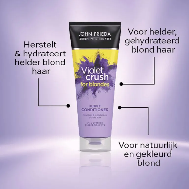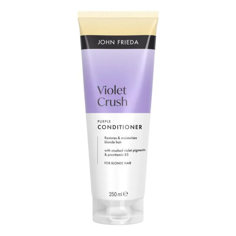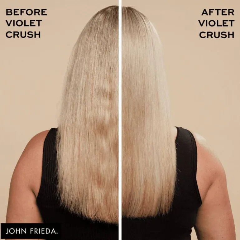 De John Frieda Violet Crush Daily Purple Shampoo is speciaal ontwikkeld om ongewenste gele ondertonen in blond haar te verminderen. Dankzij de gemalen Violet pigmenten en Provitamine B5 neutraliseert deze shampoo koperachtige tinten en geeft het je blonde haar een heldere, frisse uitstraling. De hydraterende formule reinigt zonder uit te drogen en is geschikt voor dagelijks gebruik.