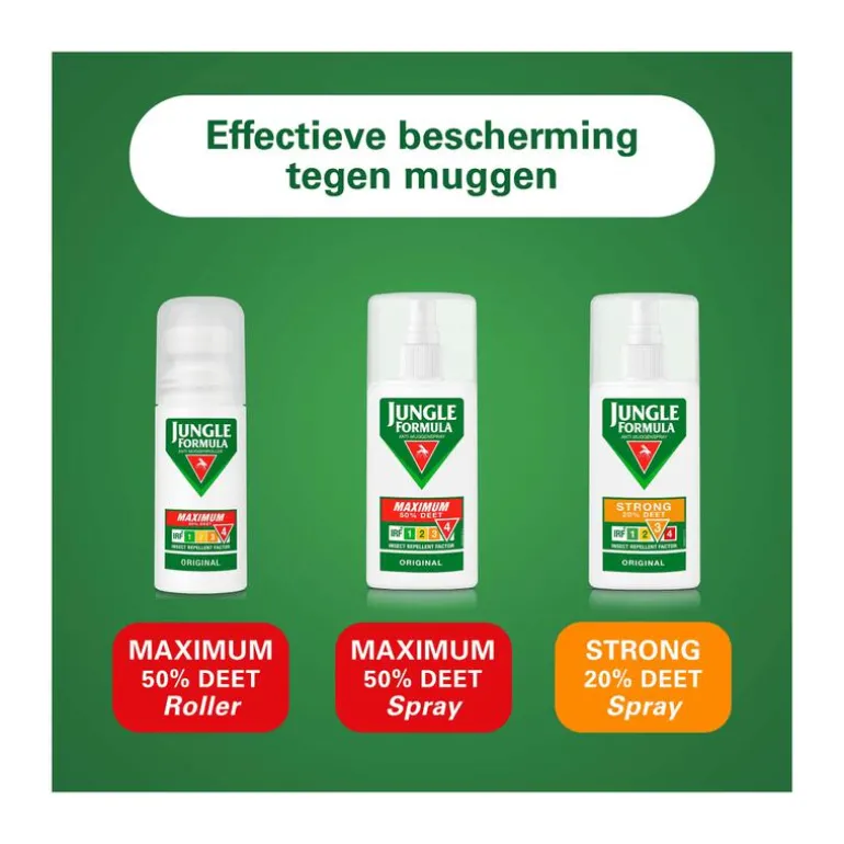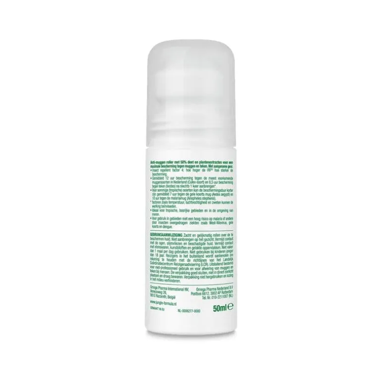 Jungle Formula Anti Muggen Roll On Maximum is een anti-insecten roller met 50% DEET en plantenextracten voor een maximale bescherming tegen muggen tot maar liefst 12 uur na aanbrengen. De Roll On biedt bescherming tegen alle soorten muggen inclusief de tijgermug. Zeer geschikt voor gebruik in gebieden met een hoog risico op malaria of andere door insecten overdraagbare ziekten.Voor volwassenen en kinderen vanaf 18 jaar Inhoud: 50 ml Toepassing Bedek zoveel mogelijk de huid met kleren om steken te voorkomen. Breng het middel aan op de nog onbedekte delen.