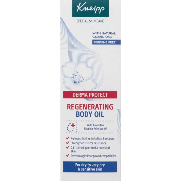 Kneipp® Derma Protect Huidolie – parfumvrij• Verzorgt de huid intensief.• De formulering, met voedende ingrediënten zoals beschermende teunisbloemolie, herstellendeamandelolie en vitamine E, beschermt denatuurlijke huidbarrière en verbetert het huidherstel.• Verlicht jeuk, een gespannen huidgevoel en vermindert roodheid van de huid.• Ervaar 24u lang een gekalmeerde, beschermde en verzorgde huid.• Geschikt voor de droge tot zeer droge engevoelige huid.