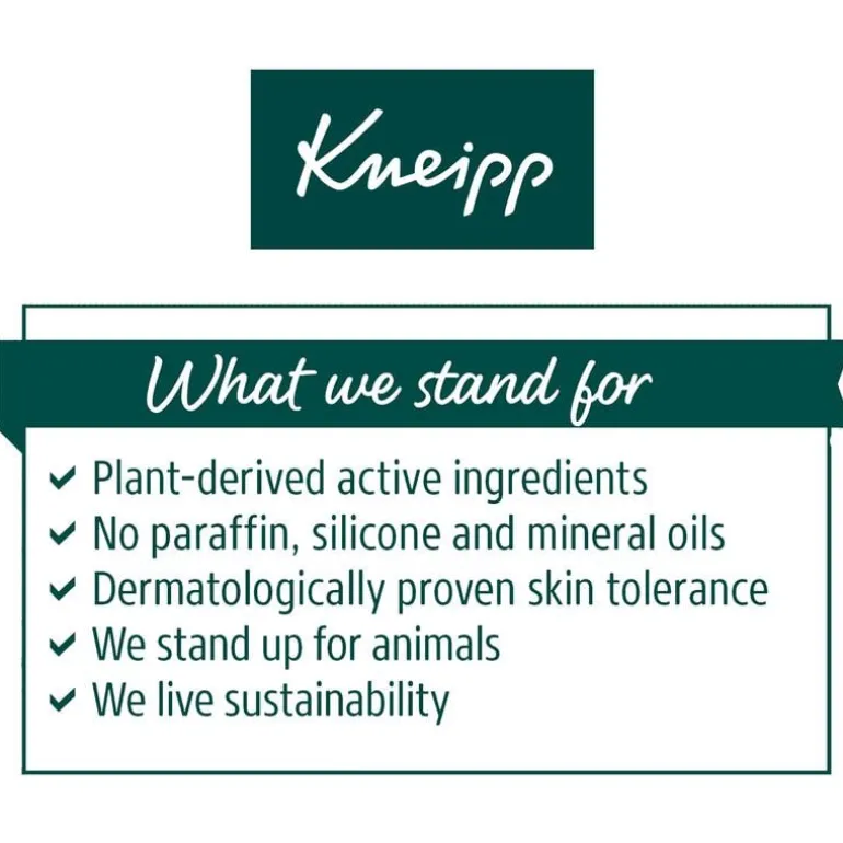 Kneipp biedt al meer dan 130 jaar hoogwaardige verwenproducten op basis van planten en kruiden; het beste uit de natuur gecombineerd met het beste uit de wetenschap. Elk product heeft een specifieke werking en geur en zorgt voor een prettig gevoel. De producten van Kneipp worden ontwikkeld door ervaren huidspecialisten en natuurwetenschappers en staan bekend om hun werkzaamheid, uitstekende geur en goede huidverdraagzaamheid. Alles om jou een optimaal verwenmoment te bieden met de kracht van de natuur. Kneipp volgt een eigen productfilosofie met strenge veiligheidsvoorschriften en streeft naar de optimale balans tussen huidverdraagzaamheid en gebruik van natuurlijke ingrediënten. Dit alles met respect voor mensen en dieren en met een ambitieuze duurzaamheidsstrategie voor de toekomst. “Alles wat we nodig hebben om gezond te blijven, heeft de natuur ons in overvloed gegeven.”(Sebastian Kneipp)