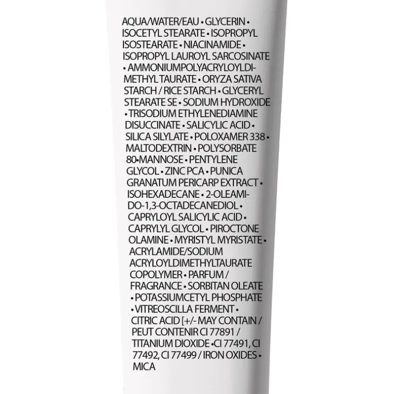 = AQUA / WATER / EAU • GLYCERIN • ISOCETYL STEARATE • ISOPROPYL ISOSTEARATE • NIACINAMIDE • ISOPROPYL LAUROYL SARCOSINATE • AMMONIUM POLYACRYLOYLDIMETHYL TAURATE • ORYZA SATIVA STARCH / RICE STARCH • GLYCERYL STEARATE SE • SODIUM HYDROXIDE • TRISODIUM ETHYLENEDIAMINE DISUCCINATE • SALICYLIC ACID • SILICA SILYLATE • POLOXAMER 338 • MALTODEXTRIN • POLYSORBATE 80 • MANNOSE • PENTYLENE GLYCOL • ZINC PCA • PUNICA GRANATUM PERICARP EXTRACT • ISOHEXADECANE • 2-OLEAMIDO-1,3-OCTADECANEDIOL • CAPRYLOYL SALICYLIC ACID • CAPRYLYL GLYCOL • PIROCTONE OLAMINE • MYRISTYL MYRISTATE • ACRYLAMIDE/SODIUM ACRYLOYLDIMETHYLTAURATE COPOLYMER • PARFUM / FRAGRANCE • SORBITAN OLEATE • POTASSIUM CETYL PHOSPHATE • VITREOSCILLA FERMENT • CITRIC ACID= • [+/- MAY CONTAIN: CI 77891 / TITANIUM DIOXIDE • CI 77491, CI 77492, CI 77499 / IRON OXIDES • MICA]. (F.I.L. N70041936/1).