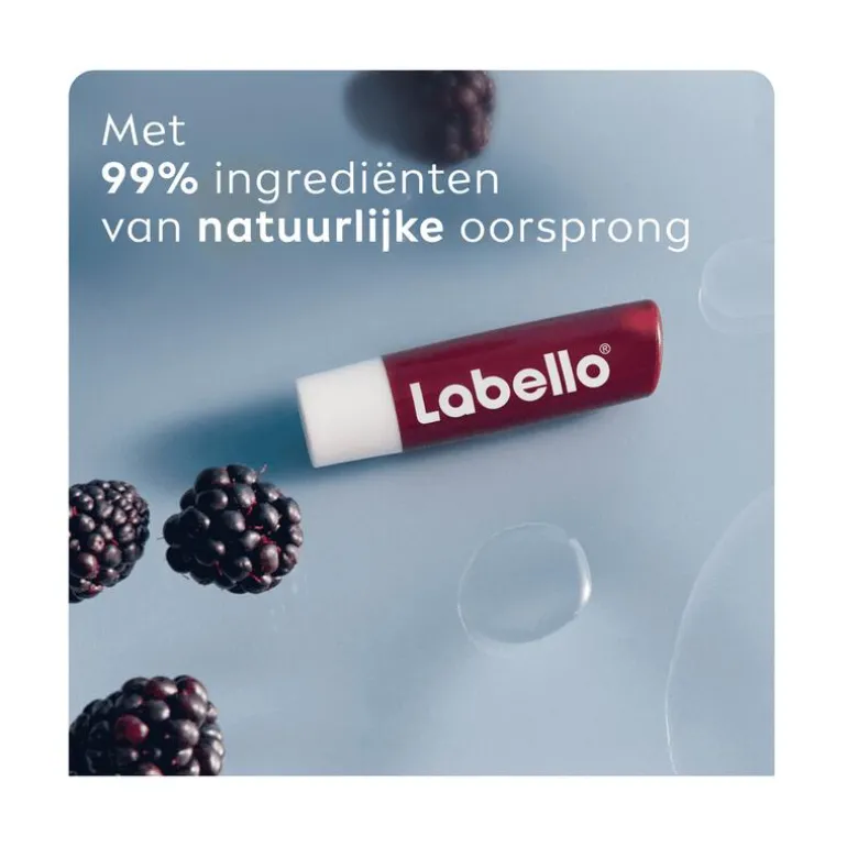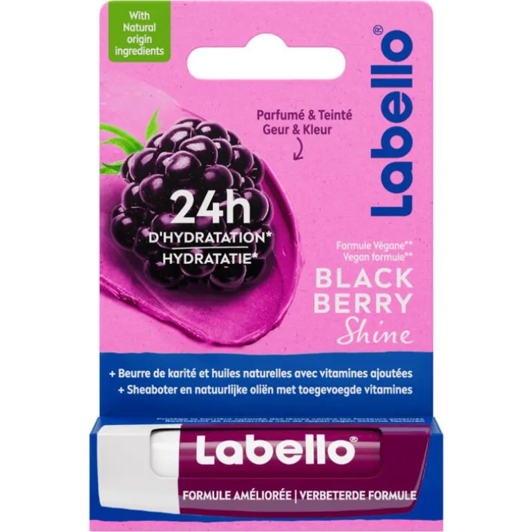 HEERLIJKE SMAAK + VERZORGING + EEN VLEUGJE KLEUR IN 1 PRODUCT? Onze VEGAN Labello Blackberry Shine biedt een heerlijk bramenaroma en een subtiele bordeauxrode glans voor je lippen. De formule, gemaakt van ingrediënten van NATUURLIJKE oorsprong, bevat ethisch geproduceerde sheaboter, oliën en vitamines die smelten op je lippen en ze meer dan 24 uur gehydrateerd houden. Deze fruitige lippenbalsem glijdt soepel over de lippen en biedt een prachtige, glanzende kleur die je lippen zacht en kusbaar maakt.