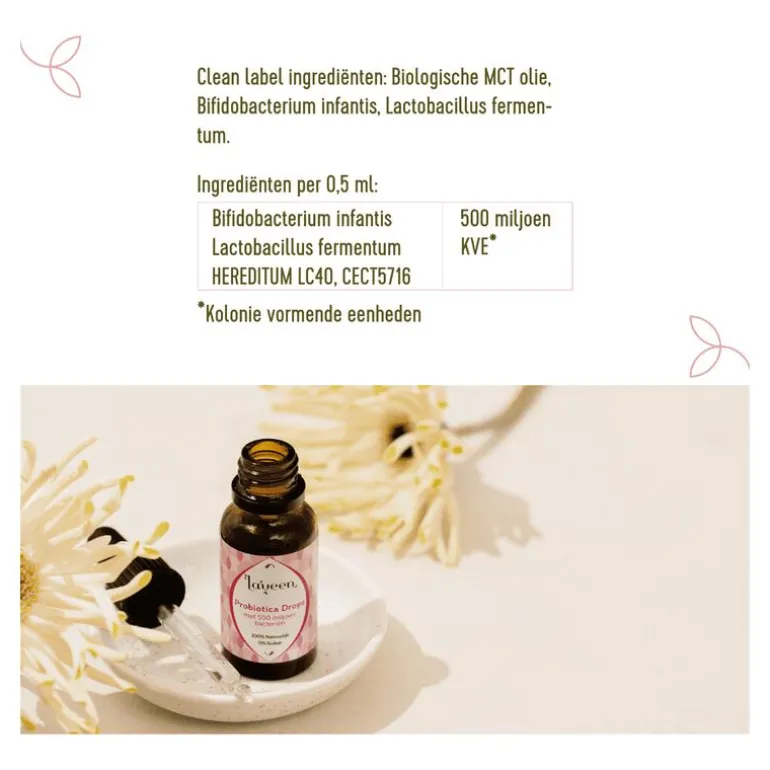 Bio-culturen drops is speciaal ontwikkeld voor baby’s vanaf de geboorte en jonge kinderen tot 4 jaar. Dit product is op basis van biologische MCT olie verkregen van kokosolie en is daardoor heel neutral van smaak. Ideaal om op de tepel te smeren tijdens borstvoeding, om toe te voegen aan de flesvoeding of gewoon op een lepeltje te geven. Bevat 500 miljoen cfu (colony forming units, oftewel: het aantal levensvatbare bacteriën dat in staat is zich te vermenigvuldigen en een kolonie te vormen) van 2 verschillende bacteriestammen Bifidobacterium infantis en Lactobacillus fermentum.