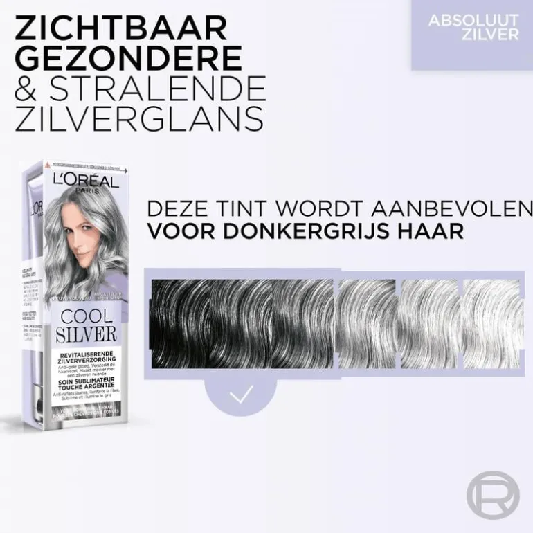 L’Oréal Paris Cool Silver Revitaliserende Zilver Verzorging is een revitaliserende zilver verzorging die speciaal is ontwikkeld voor stralend grijs haar om je haar te versterken. Dit innovatieve haarproduct zorgt voor 2x sterker haar*, tot 15 dagen anti-gele gloed* en tot wel 72 uur hydratatie* zonder je haar te beschadigen. L’Oréal Paris Cool Silver Revitaliserende Zilver Verzorging is verrijkt met krachtige ingrediënten die je haar van wortel tot punt voeden. De lichte formule verzorgt je haar intensief zonder het te verzwaren, waardoor het gehydrateerd en zacht aanvoelt en er zichtbaar gezonder uitziet. L’Oréal Paris Cool Silver Absoluut Zilver is speciaal ontworpen voor donkergrijs haar, en zorgt voor een heldere, koele haarkleur. Gebruik dit product regelmatig om de intensiteit van je haarkleur te behouden en de glans van je haar te versterken. Breng het product eenvoudig aan voor een prachtig resultaat thuis. Ideaal voor iedereen die op zoek is naar een frisse, zilverkleurige tint zonder concessies te doen aan de gezondheid van het haar. Een fles bevat tot 3 applicaties. *Instrumentele test