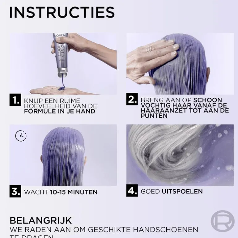 Breng L’Oréal Paris Cool Silver Revitaliserende Zilver Verzorging gelijkmatig aan op schoon nat haar na het wassen, van de haaraanzet tot aan de punten. Masseer het zachtjes in en laat het 10-15 minuten intrekken om ongewenste warme tinten te neutraliseren. Spoel vervolgens grondig uit met water voor een fris en stralend resultaat. Zo gemakkelijk aan te brengen als een haarmasker!