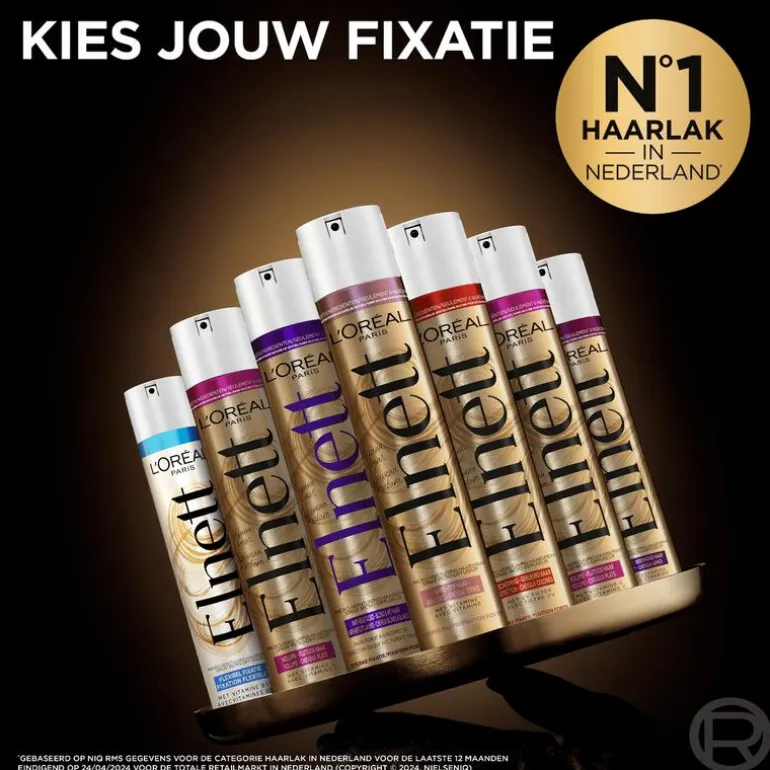 L’Oréal Paris Elnett Shine Sterke Fixation Haarlak zorgt voor een langdurige glans in het haar en een fixatie tot 48U lang*. *Instrumentele test