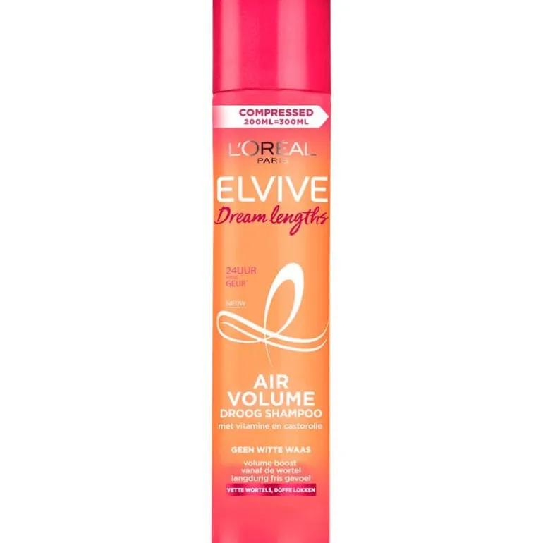 Klaar met vet haar & weinig volume? Elvive Dream Lengths Air Volume Dry Shampoo! Deze droogshampoo absorbeert vet & boost je volume, zonder een witte waas. Stel je wasbeurt uit met deze onzichtbare fix, die je de hele dag textuur & volume geeft. Het resultaat De Elvive Dream Lengths Air Volume Dry Shampoo zorgt voor een onmiddellijke volume boost vanaf de wortels en een langdurig fris gevoel. Dit komt doordat de Air Volume Droog Shampoo vitamine en castorolie bevatten die het haar voeden en reinigen. Zodat jouw haarvet wordt vermindert zonder dat er water aan te pas komt.