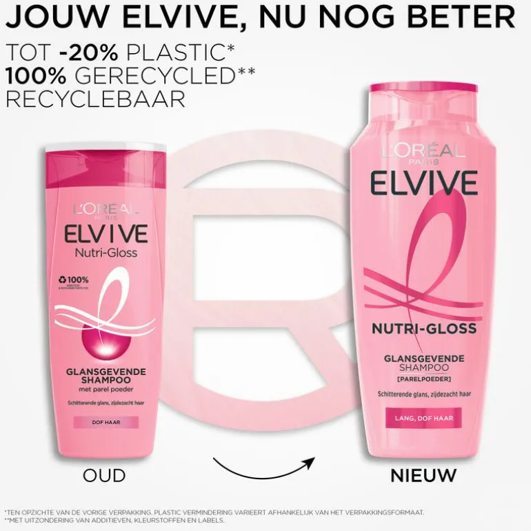 De ElviveNutri-Gloss Shampoo van L’Oréal Paris voedt, verzacht en revitaliseert het haar voor een glanzend zijdezacht gevoel. De glansgevende shampoo is speciaal ontwikkeld voor lang en dof haar. Hoe langer je haar is, hoe gevoeliger het wordt. Het haar kan na verloop van tijd dof worden: het heeft een gebrek aan glans, vitaliteit en zachtheid. De L’Oréal Paris ElviveNutri-Gloss Shampoo verrijkt met parelpoeder reinigt, omhult de haarvezel en maakt het haar weer schitterend glanzend en zijdezacht. De ElviveNutri-Gloss Shampoo van L’Oréal Paris zorgt voor perfect gevoed en glad haar, dat het licht mooi vangt en weerkaatst. Het haar blijft licht en zacht. Jouw Elvive, nu nog beter! Onze vernieuwde fles is gemaakt met tot -20% minder plastic* en is gemaakt van 100% gerecycled plastic**. Daarnaast is de fles ook recyclebaar. *Ten opzichte van de vorige verpakking. Plastic vermindering varieert afhankelijk van het verpakkingsformaat. **Met uitzondering van de additieven, kleurstoffen en labels.